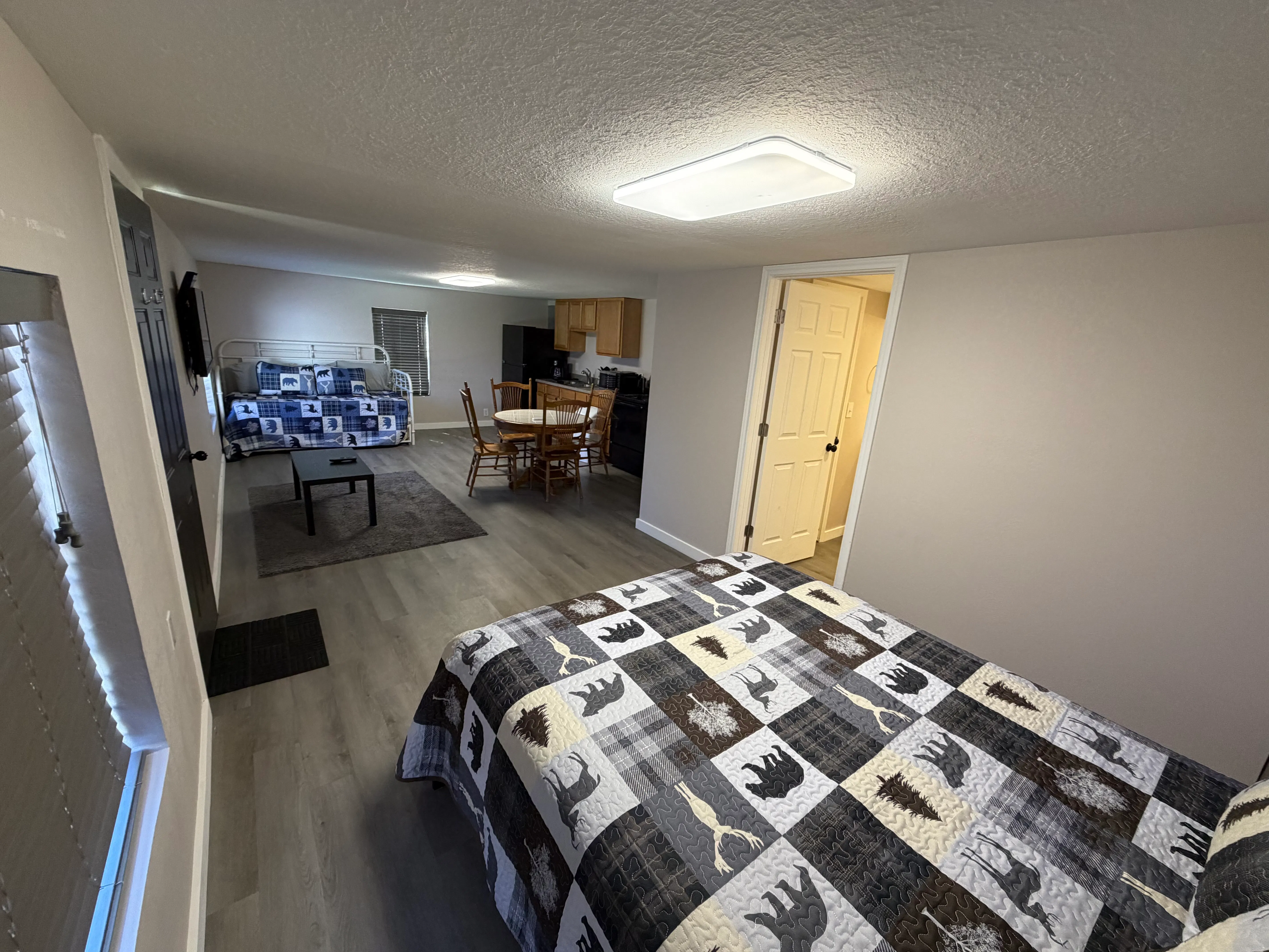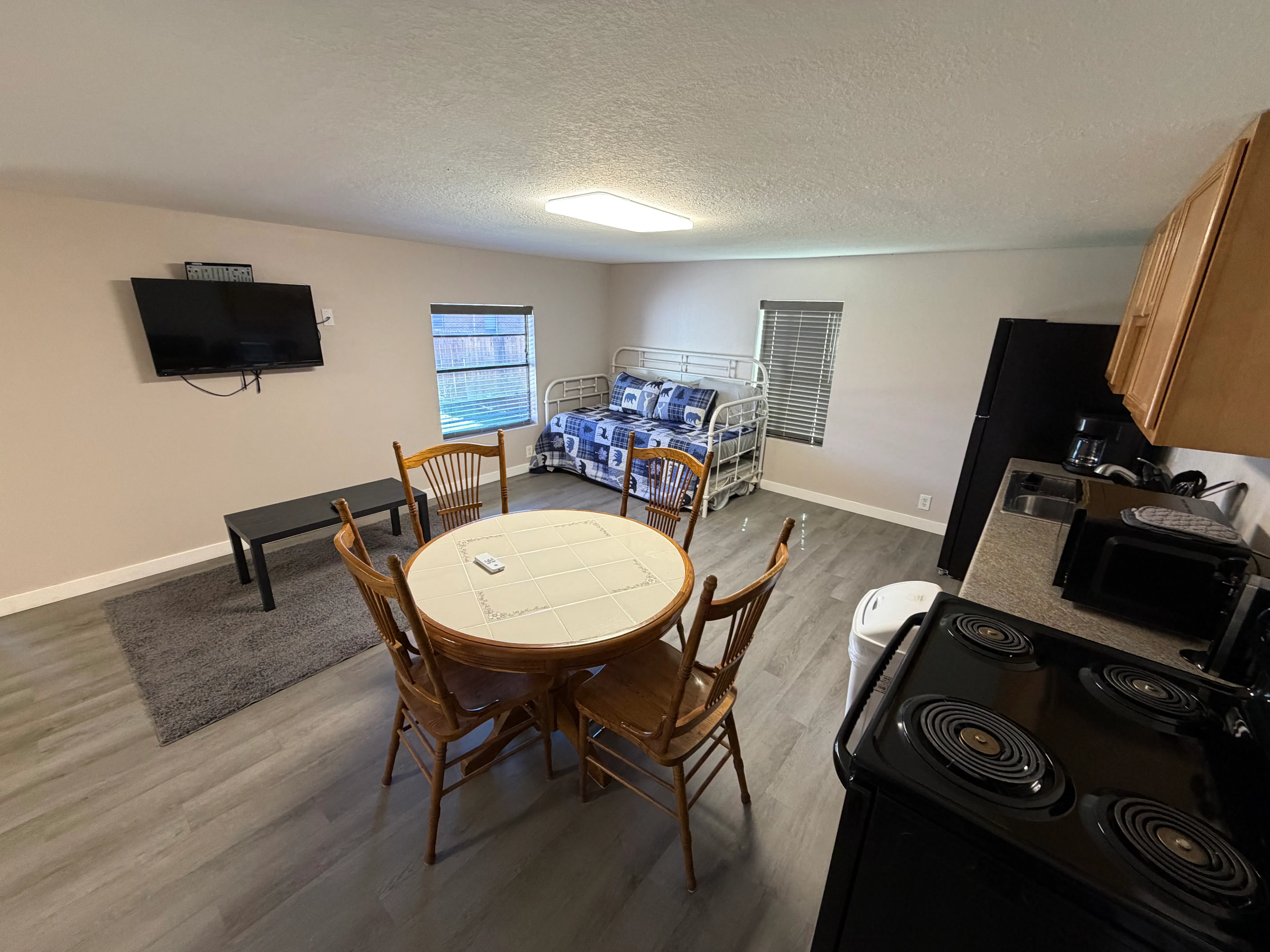 Unwind in our charming studio apartment, where comfort meets convenience! Enjoy the freedom to cook up a storm in our fully equipped kitchen and start your day off right with in-room coffee. Stay connected with free Wi-Fi and make yourself at home in our thoughtfully designed space. Perfect for a relaxing getaway or an extended stay, our studio apartment is your home away from home. Includes one Queen size bed, and one Trundle Day bed (two twins)